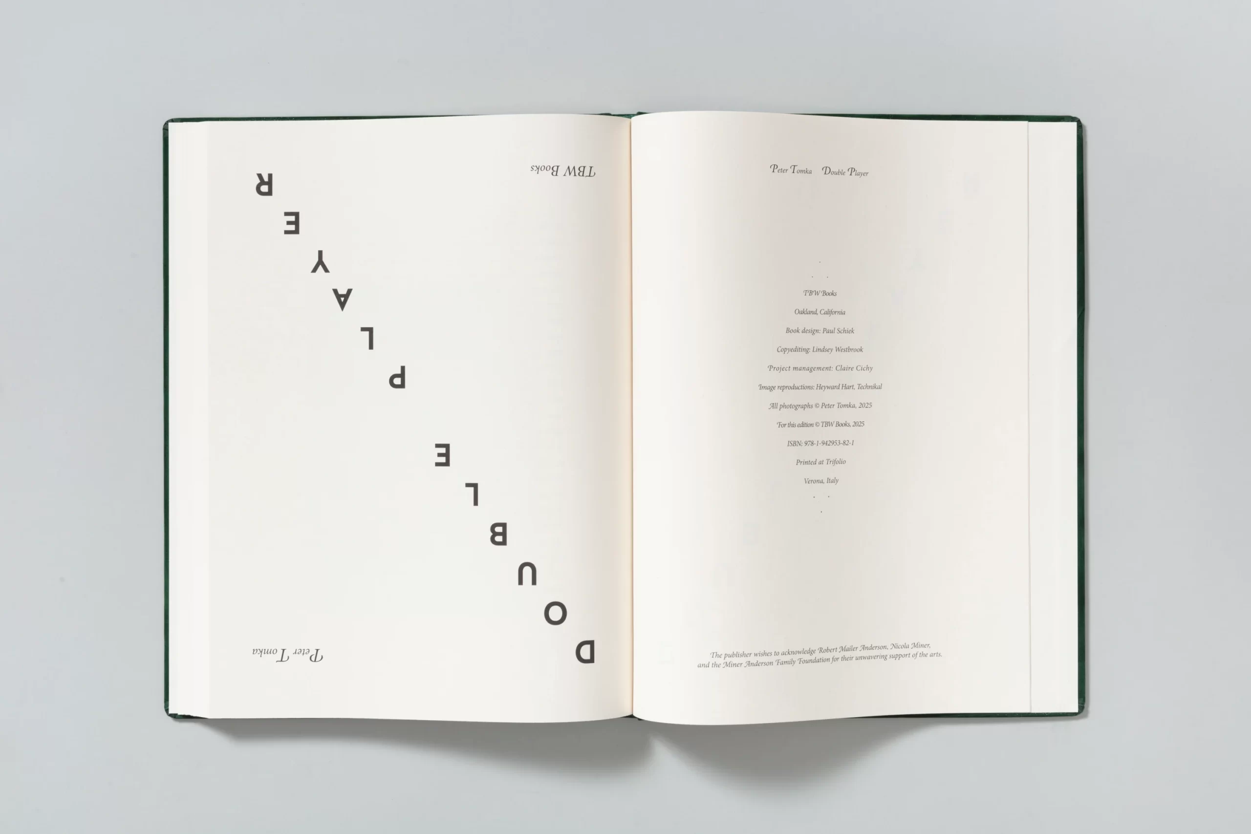 TBW Books is proud to present Double Player, an unconventional photographic book form by Peter Tomka that demands to be experienced by two people. This work unfolds and folds back into itself—a Möbius loop of imagery, or perhaps an ouroboros: an endless cycle of visual connections shared in real time between both viewers.
