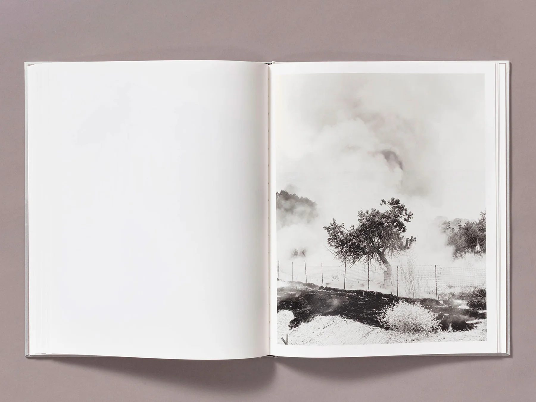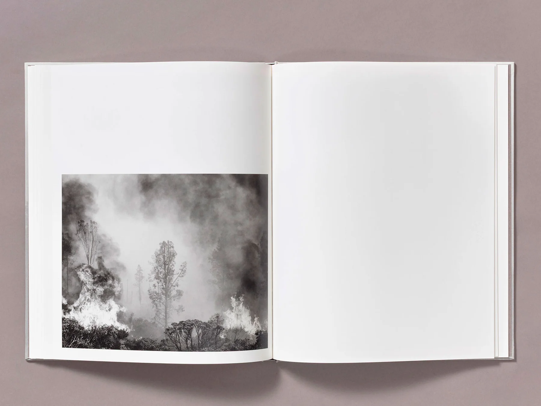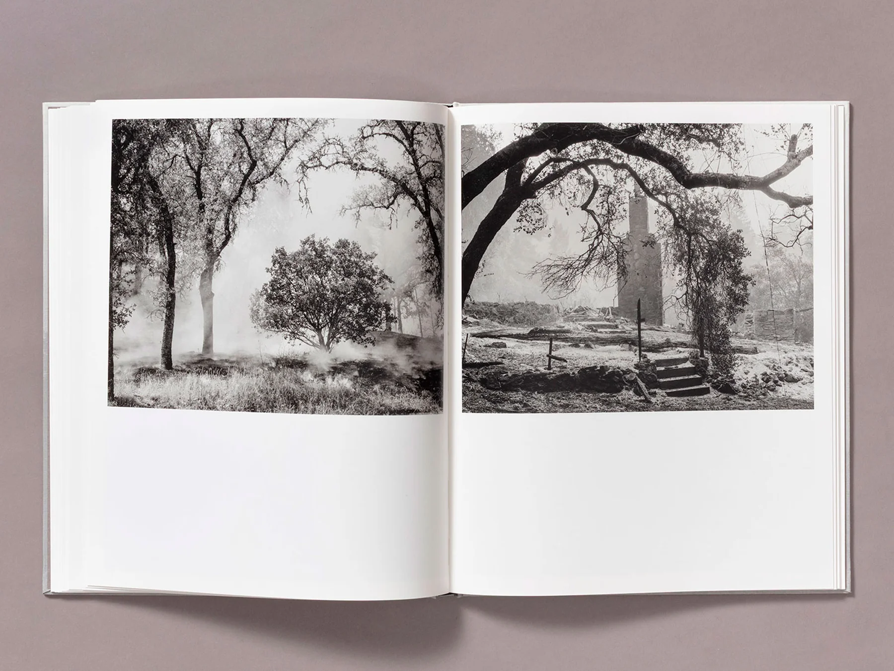 His photographs, seemingly suspended out of time in a muffled silence, at the edge of the catastrophe, are a meditative exploration on this liminal stage between calm and violence, on the fine line we dance on when we build and expand on nature’s ground. A meditation on the harshness, anxiety, and beauty of wildfires—which can, as well as destroy, prepare a fertile ground for new life to start.